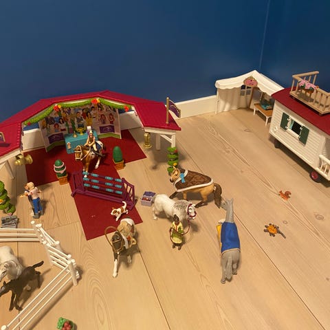 Hus med forskjellige møbler, 4 hester med tilbehør