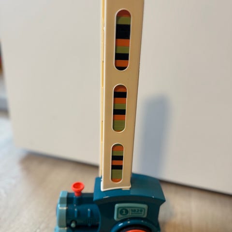 Toget kjører og setter ut brikker til dominospill. Lite brukt