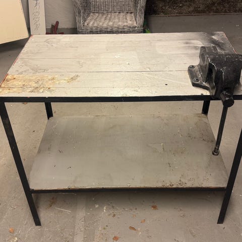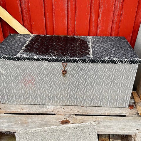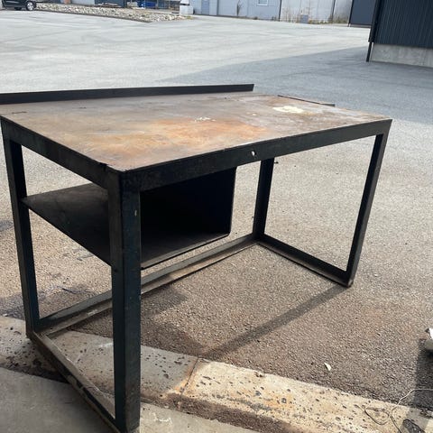Rustfri arbeidskum / vaske-/skyllekar i stål med ben. Rektangulær kum med avløpshull i bunnen og rette sider. Kummen står på faste ben som gir arbeids- og oppbevaringshøyde over gulv. Egner seg til bruk i verksted, industri, garasje eller andre miljøer der det er behov for en robust stålkum til vask, skylling eller oppsamling. Mål og tykkelse på platene fremgår av bildene med målebånd. Overflaten har synlige merker og misfarging etter bruk, men konstruksjonen fremstår som solid med sveisede hjørner og kanter..