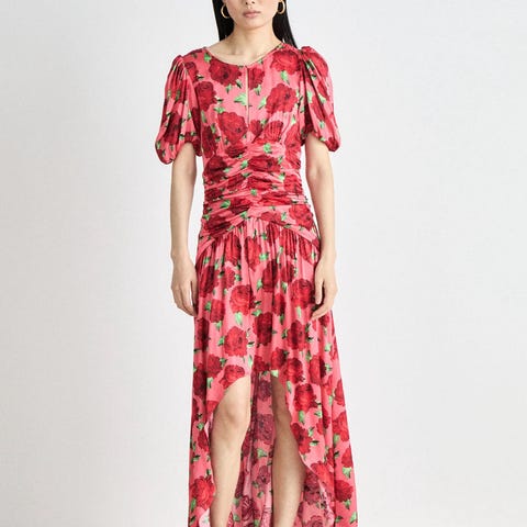 Cras Elaine festkjole i størrelse M for dame. Kjolen er en maxikjole med flerfarget rosemønster. Den har korte puff-ermer, rund hals og et asymmetrisk skjørt. Midjen er drapert for en markert fasong. Materiale: viskoseblanding (ifølge merkelapp: 52 % EcoVero, 48 % viskose). Egner seg som festkjole og til andre anledninger der man ønsker en lang kjole med mønster.