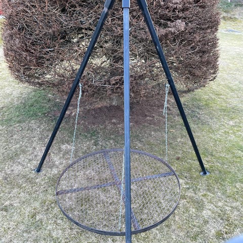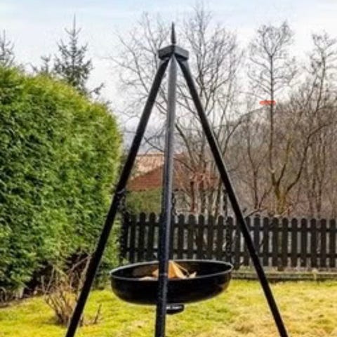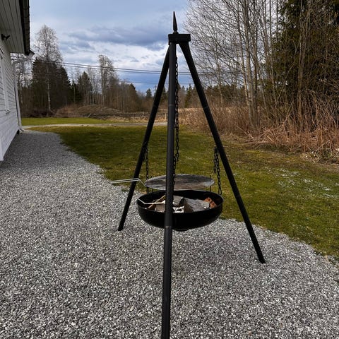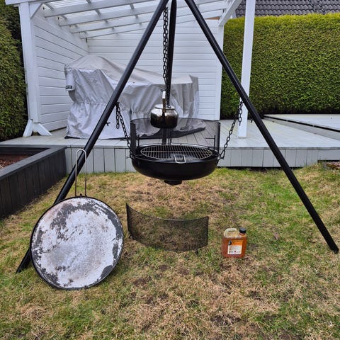 Trefot bålpanne med rund ildskål og oppheng i stativ. Bålpannen har justerbar grillrist som kan henges under eller over ildskålen etter behov. Leveres med beskyttelsestrekk som dekker hele stativet. Egnet til bruk på terrasse eller i hage på brannsikkert underlag, til bål og enkel grilling utendørs. Merke er Espegard, kjøpt på Jernia.