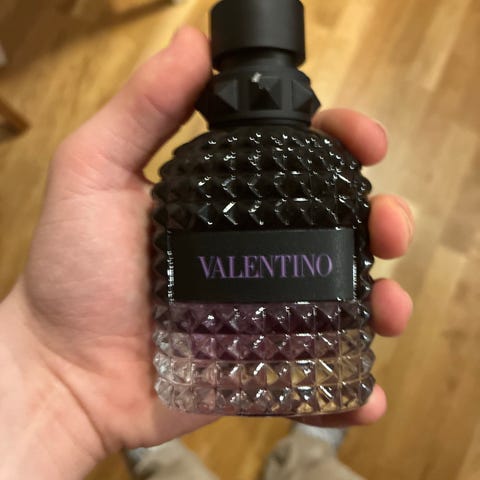 Valentino parfyme i svart flaske med strukturert overflate. Flasken har karakteristisk nupret design og sort kork. Passer til oppbevaring av duft/parfyme. Nærmere informasjon om dufttype, modellnavn, volum og mål er ikke oppgitt og kan eventuelt sjekkes på undersiden av flasken eller originalemballasjen dersom dette er tilgjengelig.