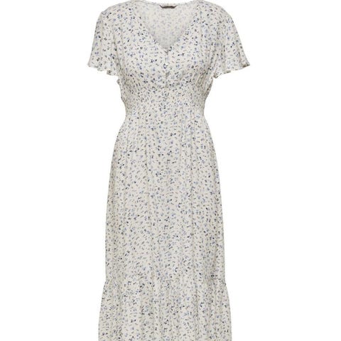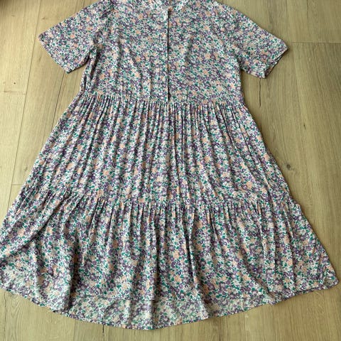 Pigalle sommerkjole for dame i størrelse M. Kjolen er i blå bomull med småblomstret mønster. Den har krage, knappelukking foran og 3/4-lange ermer med lett puff. Skjørtet er lett utsvingt med rynker fra livet for en løs og komfortabel passform. Egnet til hverdagsbruk og sommerlige anledninger.