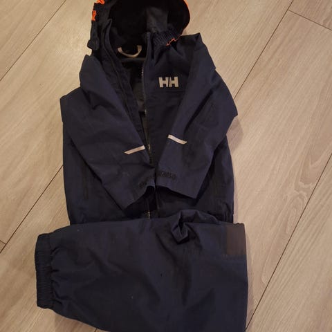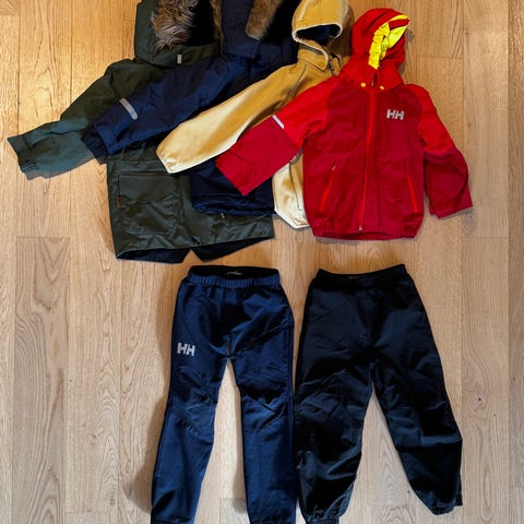 Uteklær sett i størrelse 104. Settet består av flere plagg i ulike farger. Klærne er beregnet for gutt og inkluderer blant annet yttertøy og mellomlag som passer til bruk i barnehage og uteaktiviteter (bilde 1: Helly Hansen skalljakke, Helly Hansen skallbukse, Didriksons skallvotter, Reflex fleecedress, Escandinavian Explorer boblejakke og ubrukt H&M ull og skjerf i Merino ull og bilde 2: Reima skalldress, Reima skallvotter og H&M skallbukse).