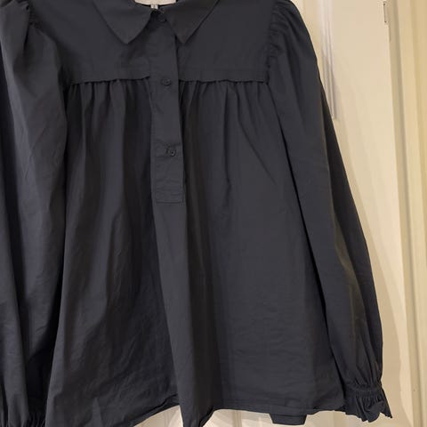 By Malene Birger bluse for dame i størrelse 38. Blusen er svart og laget av bomull. Modellen har knapper i front, ståkrage og markerte volangdetaljer langs skuldre, ermer og nederkant. Ermene er trekvartlange med rysjer ved mansjettene. Passer til hverdagsbruk eller mer pyntede anledninger, og kan kombineres med både bukser og skjørt.