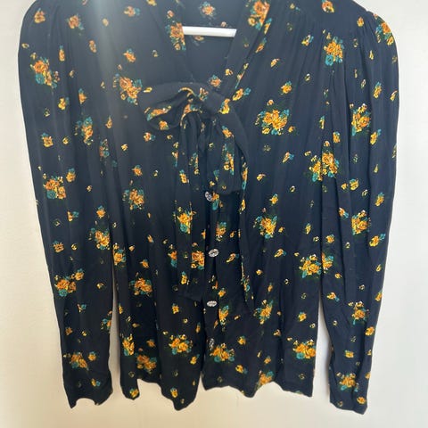 Nydelig blomstret vintage bluse med knyting i halsen og lange ermer fra Piero de Monzi. Detaljene gir et lett og personlig uttrykk og er perfekt nå som det blir varmere i været. Knappene er kronen på verket og smykker blusen på elegant vis.