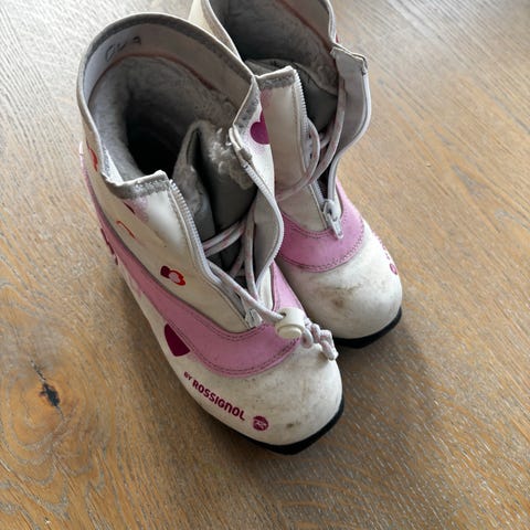 Rossignol W nordic skisko for barn i størrelse 32. Skiskoene er hvite med rosa detaljer og hjerte-motiv. Sålen er merket Rossignol og er tilpasset klassisk langrennsbinding. Innvendig har skoene mykt, pelsliknende fôr for ekstra varme og komfort. Egnet til langrenn for barn som bruker skostørrelse 32.