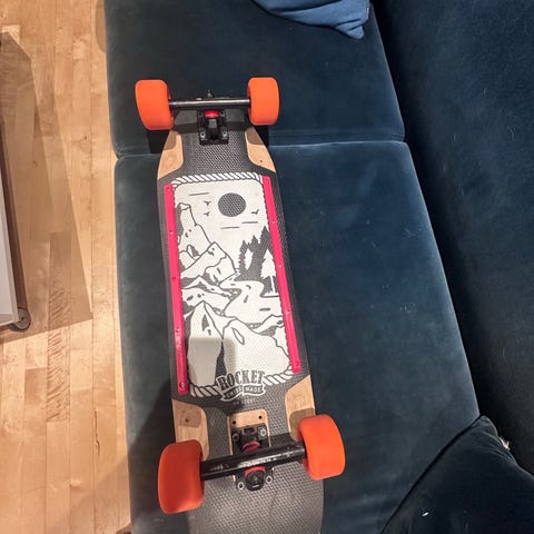 Boosted Mini elektrisk skateboard. Kompakt elektrisk longboard med integrert motor og batteri under brettet. Utstyrt med oransje hjul og dobbel bakre truck med drivhjul. Brettet har sklisikkert griptape på oversiden og Boosted-logo på decket. Medfølgende fjernkontroll og lader for styring av hastighet og lading av batteri. Egnet til pendling og kortere turer på asfalt og jevnt underlag.