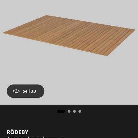 Rusta akustikkpanel veggpanel i varm eik. Panelene har tre-ribber i FSC-merket MDF med eikefinish og akustikkfilt i PET på baksiden. Lengde ca. 117,5 cm, bredde ca. 36 cm og tykkelse ca. 15 mm. Avstand mellom ribbene er ca. 13 mm. Panelet er beregnet for montering på vegg for å bidra til lydabsorpsjon (lydabsorpsjonsklasse C) og gi et ribbestrukturert uttrykk i rommet.