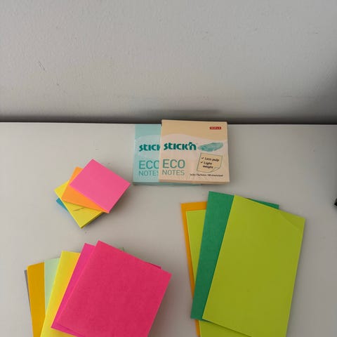 Sett med diverse kontorrekvisita. Inneholder flere blokker med selvklebende notatlapper i ulike størrelser og farger, inkludert neonfarger. Det følger også med plastindeksfliker i flere farger for merking av dokumenter. I tillegg er det sekskantede skriveblokker i grå og hvite nyanser, samt et utvalg binders i ulike størrelser i metall. Egnet til organisering, merking og notering på kontor, hjemme eller på studier.