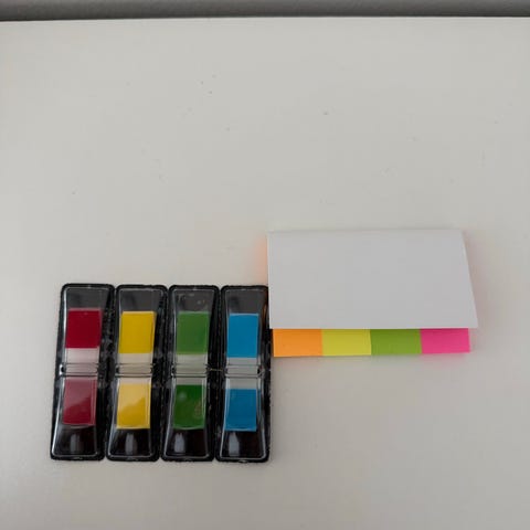 Kontorrekvisita sett med notatlapper, indeksfliker, hexagonblokker og binders