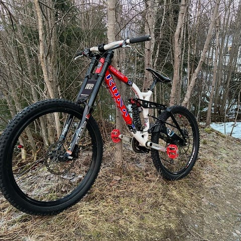 Sykkelen er satt opp med 1x10 gir. Det vil si: kun ett tannhjul foran (og dermed ingen girshifter der) + 10 gir bak. Fungerer enkelt og perfekt i skogen.