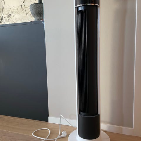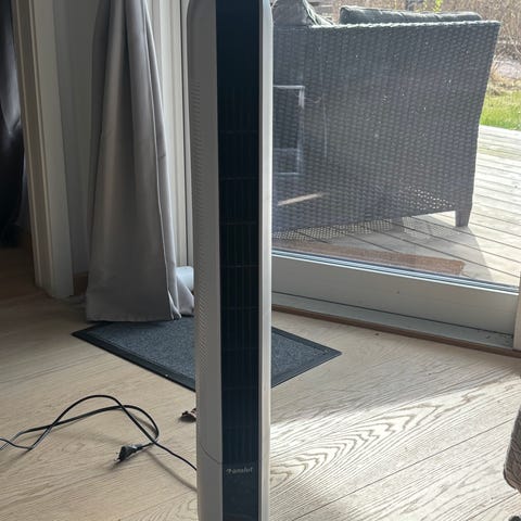 Tårnvifte i hvit farge med sort frontpanel. Viften har berøringspanel på toppen med funksjoner for oscillasjon, ulike driftsmoduser, timer, hastighetsjustering og av/på-knapp. Egnet for bruk innendørs til sirkulering av luft i rom som stue, soverom eller kontor. Vanlige bruksmerker (bilde nr3). Kjøpt for 2 år siden, lite brukt.