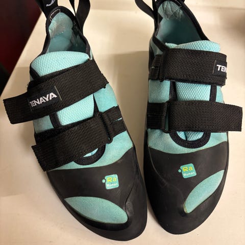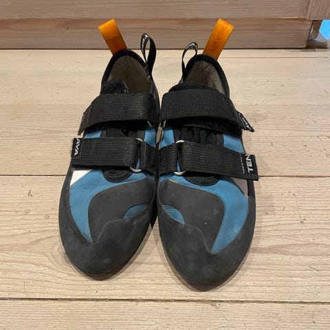 Disse er veldig lite brukt da jeg fikk noen andre som passet meg bedre. Snakk om 1-2 gangers bruk i klatresenter. Disse er av høy kvalitet og kan brukes til all type klatring. Nypris var 2199,-.