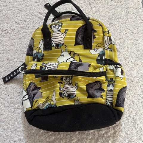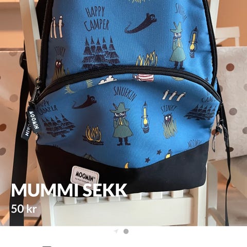 Moominvalley barnehagesekk i blå farge med motiv fra Mummidalen på frontlommen. Sekken har ett hovedrom med glidelås og en mindre frontlomme med glidelås. Justerbare skulderstropper og bærehank på toppen. Passer til små barn til bruk i barnehage eller korte turer.