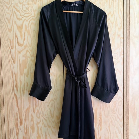 Elegant svart morgenkåpe / kimono i 100% silke. Blonder på armene. Knyting på innsiden i tillegg til silkebånd i livet. Størrelse 36/38. Nesten ubrukt. Selges rimelig pga små rynker i materialet ved skuldrene pga oppbevaring.