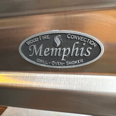 Memphis pelletsgrill i rustfritt stål. Grillen har lokk med håndtak, grillrister i rustfritt stål og sidebord på begge sider. Betjeningspanel på høyre side for å sette temperatur og bytte mellom visning av omgivelses- og probetemperatur.. Under grilldelen er det skap for oppbevaring og aluminiumsbakker for å ta i mot aske/grillrester.