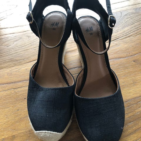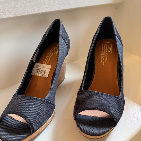 Toms kilehælsko med åpen tå i størrelse 37. Skoene har svart tekstiloverdel og kilehæl i korklook. Som nye.