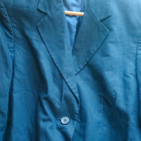 Dobbeltspent blazer for herre i størrelse 46, kjøpt på Follestad. Blazeren er blå og laget i lin. Modellen har dobbeltspent lukking med lyse knapper foran og fire knapper nederst på ermene. Klassisk jakkeslag og brystlomme, samt lommer foran. Innsiden har merkede etiketter og innerlommer. Egnet som lett dressjakke eller blazer til både formelle og mer uformelle anledninger i varmere vær på grunn av linmaterialet.