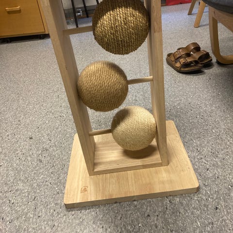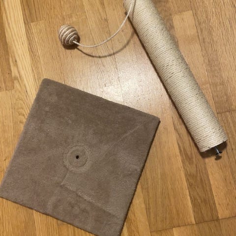 Klatrestativ for katt med stolpe kledd i sisal for kloring. Øverst er det en rund plattform trukket i mykt stoff med ball i snor som leke for katten.