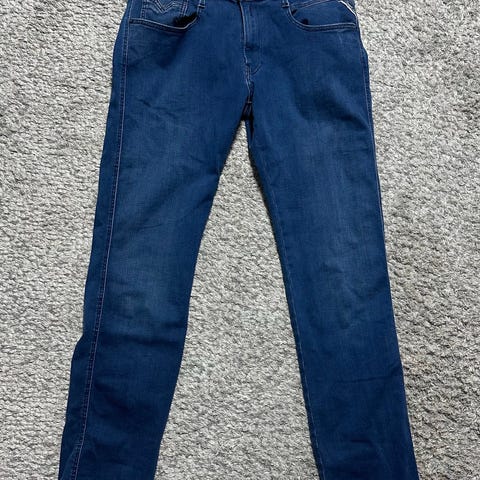 Course jeans W36 L34 kevlarfôret bukse i blå denim. Ytterstoff i 100 % bomull med fôr i 100 % kevlar. Buksen har klassisk femlommers design og rette ben. Størrelse W36 L34 angitt på lappen. Egnet som robust bukse der det er ønskelig med ekstra slitestyrke i materialet.