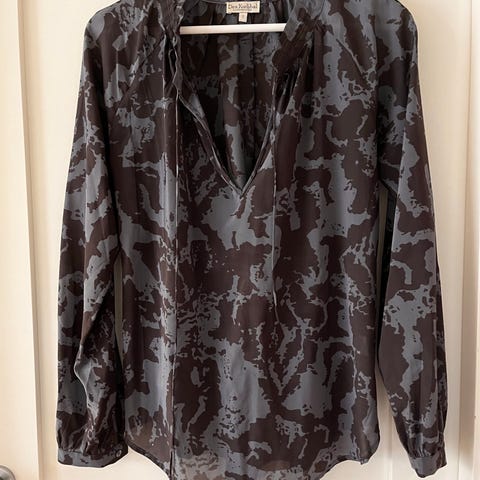 Dea Kudibal Seattle bluse for dame i størrelse S. Blusen er i blått mønster og er laget av silke med noe elastan for lett stretch. Modellen har lange ermer med mansjetter og knapp. Hekte i halsen. Materiale ifølge lappen: 90 % mulberrysilke og 10 % elastan. Passer til bruk både til hverdags og mer formelle anledninger.