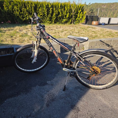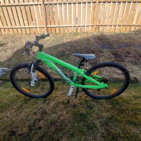 Scott barnesykkel med 24" hjul. Sykkelen har grovmønstrede dekk som egner seg for både asfalt og grus. Utstyrt med felgbremser foran og bak samt girbetjening på styret. Passer til barn som skal over fra mindre barnesykkel til en større modell med 24-tommers hjul.
