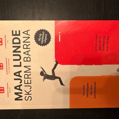 Maja Lunde Skjerm barna bok. Sakprosa om barn, teknologi og skjermbruk, med fokus på hvordan digital teknologi påvirker barndommen. Boken er innbundet og på norsk, og passer for voksne som ønsker kunnskapsbasert informasjon om temaet barn og skjermtid.
