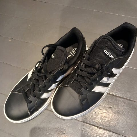 Adidas sneakers i størrelse 46. Modellen har svart overdel med hvite Adidas-striper på sidene og lys såle. Snøring foran og polstret kant rundt ankelen. Passer til hverdagsbruk og lett fritidsaktivitet.