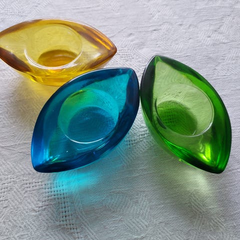 Selger et dekorativ lysestake i glass. Det har et elegant og unikt design med flere detaljer i både klart glass og kontrastfarger, som gjør den til et fint blikkfang på bord, hylle eller i vinduskarmen.