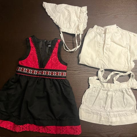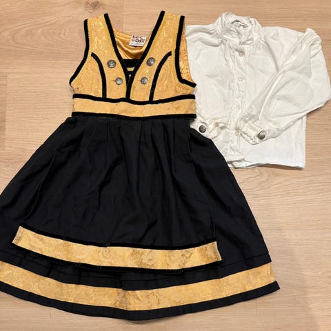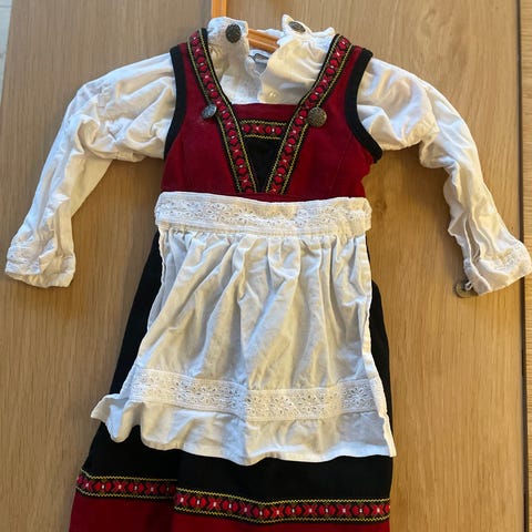 En fin festdrakt med body, belte og forkle i str 92 cm, 24 mnd, 2 år. Den har fine forseggjorte detaljer, blant annet et dekorativt belte som festes med borrelås. Noen bruksmerker, generelt i god stand. Skjorten kan med fordel klores, for de som ønsker den helt hvit uten bruksmerker.