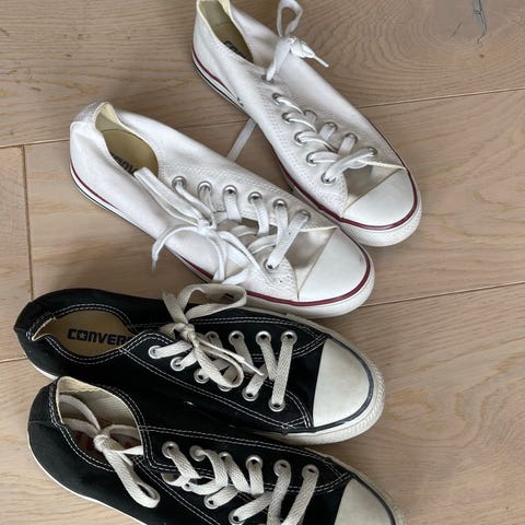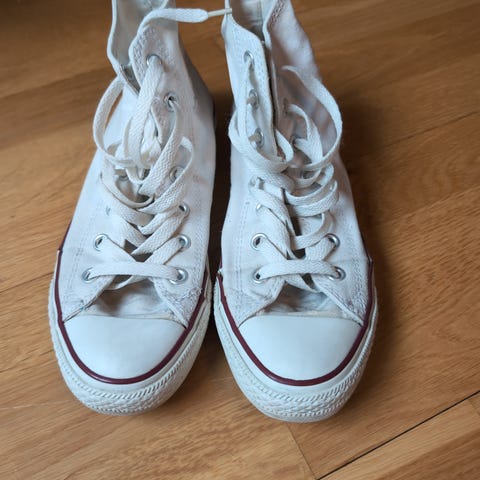 Converse All Star sneakers i hvit farge, størrelse 38,5. Klassiske joggesko med snøring foran og gummisåle. Overdel i tekstil med skinn på ytterside, Converse-logo på siden. Passer til hverdagsbruk og fritid. Dette er en lavere og litt smalere modell så virker litt mindre i str. Skoene er nyvasket og anbefaler kjøper å impregenere før bruk.