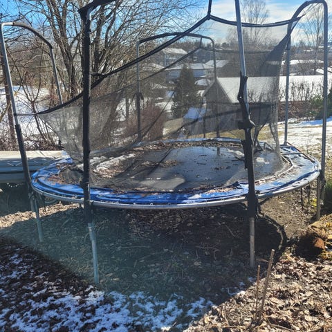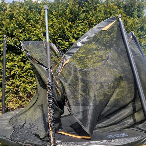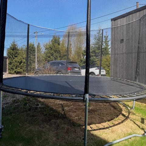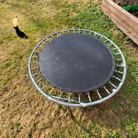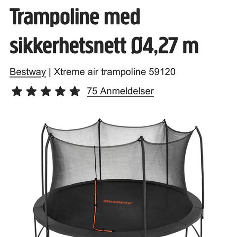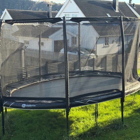 Rund trampoline med sikkerhetsnett. Trampolinen har metallramme og ben i stål, samt hoppeflate med omkransende kantpute. Sikkerhetsnettet er festet til stolper rundt hele trampolinen for å redusere risiko for fall utenfor hoppeflaten. Egner seg til utendørs bruk i hage eller på gårdsplass.