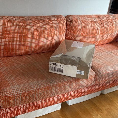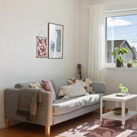 Selger en pen og komfortabel 3-seter sofa, trolig fra IKEA sin KARLSTAD-serie. Sofaen har et tidløst og enkelt design med rette linjer, lyse treben og avtakbart, hvitt trekk.