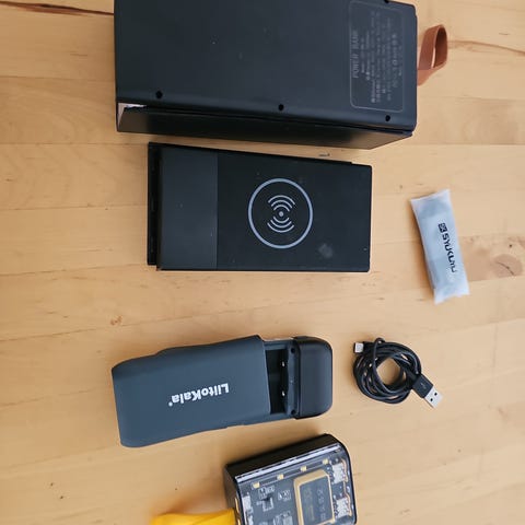 Powerbanken er laget i hard plast og har et kompakt, rektangulært design i mørk farge. Den innebygde USB‑C kabelen brukes til lading av kompatible enheter, og det finnes i tillegg en USB‑C port og en USB‑A port for tilkobling av andre kabler. Enheten er egnet for lading av mobiltelefoner, nettbrett og annet utstyr som kan lades via USB.
