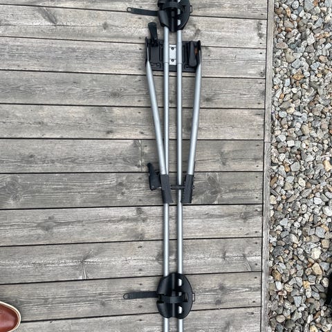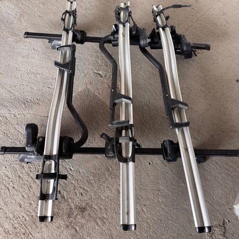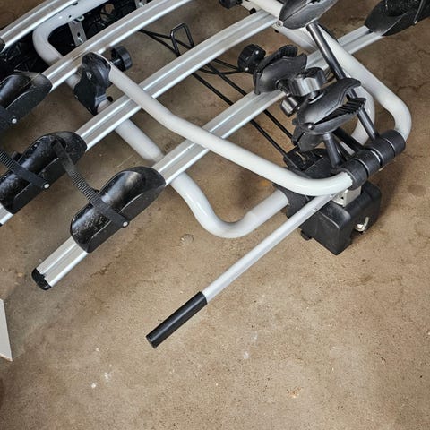 Sykkelstativ til bil for montering på hengerfeste. Stativet er i metall med grå ramme og svarte plastfester til opp til 4 sykler. Det har flere holdere og stropper for å feste syklene sikkert til stativet. Egnet for transport av flere sykler, avhengig av sykkeltype og vekt. Stativet kan justeres i vinkel og foldes sammen for enklere oppbevaring når det ikke er i bruk. Passform kan variere mellom ulike bilmodeller, og brukeren bør kontrollere kompatibilitet med egen bil før montering.
