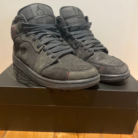 Nike Air Jordan barnesko i høy modell i størrelse 40,5. Skoene er i grå og hvit fargekombinasjon med snøring foran. Overdelen er i syntetisk materiale og tekstil med perforert tåparti for ventilasjon. Polstret hæl og tunge gir ekstra komfort rundt ankelen. Yttersåle i gummi med mønster for grep. Unisex-modell som passer til hverdagsbruk og fritidsaktiviteter. Meget pent brukt en kort sesong.