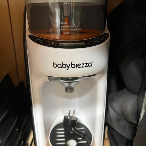 Baby Brezza Formula Pro pulverblander til morsmelkerstatning i svart farge. Enheten blander pulver og vann automatisk direkte i tåteflaske. Den har beholder for pulver på toppen og vannbeholder bak, samt digitalt display på fronten for innstillinger. Passer til standard tåteflasker som plasseres i åpningen foran. Egnet for tilberedning av morsmelkerstatning til spedbarn og småbarn i hjemmet.