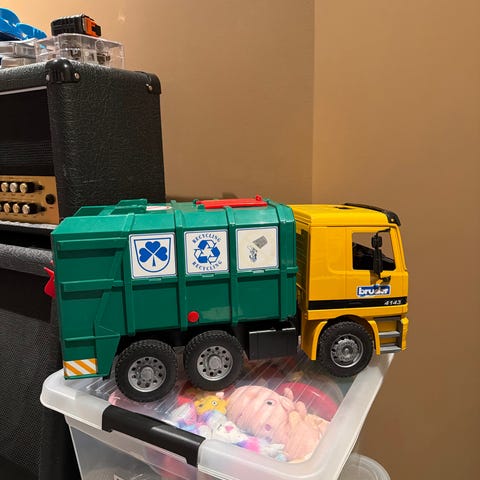 Bruder lekebil søppelbil i oransje plast, ca 45 cm lang. Modellen forestiller en renovasjonsbil med detaljer som førerhus med ratt, avfallsbeholder bak og klistremerker med resirkuleringssymboler på sidene. Bak på bilen er det to gule søppelkasser som kan festes til løftemekanismen.