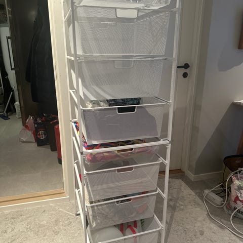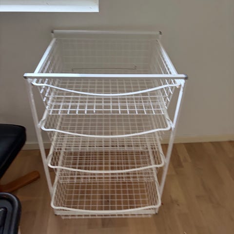 Et stativ med "trådkurver" i tøy. Fra ikea. 4 like store skuffer/kurver. Stativet er 70 cm høyt, 45cm bredde og 54cm dybde. Noe merker/flekker på kurvene/skuffene. Må hentes