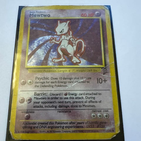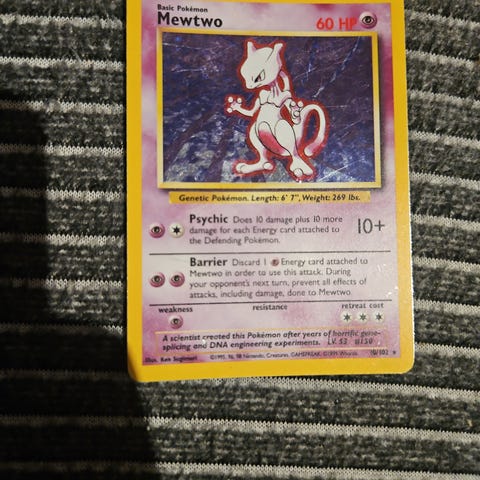 Pokémon Mewtwo samlekort. Kortet viser Mewtwo med 60 HP og angrepene Psychic og Barrier. Standard Pokémon-bakside. Egnet for samling eller bruk i Pokémon Trading Card Game.