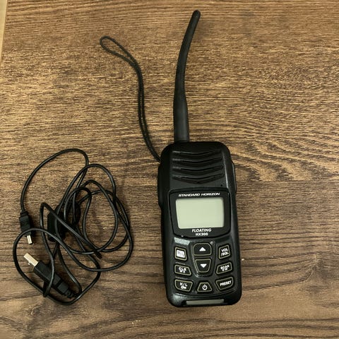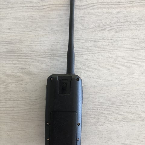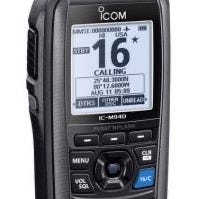 Icom IC-M93D håndholdt VHF-radio i svart. Modellen har lang antenne og skjerm som viser kanal og informasjon. Egnet som bærbar VHF for bruk om bord i båt eller andre maritime miljøer der man trenger trådløs kommunikasjon over VHF-båndet. Enheten har knapper for hurtigvalg av kanal og meny, samt tydelig display for avlesning av data.