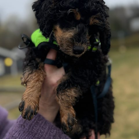 Nydelig mørk puddel- tispe- tricolor- telegant og langbent, rolig og trygg, kjelen, nysgjerrig og leken.
