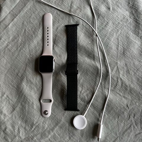 Apple Watch Series 3 smartklokke med 38 mm urkasse. Klokken har rektangulær berøringsskjerm og integrerte sensorer på baksiden for pulsmåling. På siden sitter digital crown og sideknapp for navigasjon og funksjonsvalg. Medfølgende magnetisk ladekabel. Egnet til bruk med kompatible iPhone-modeller for varsler, aktivitetsmåling og grunnleggende treningsregistrering. Nesten ikke brukt.