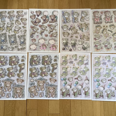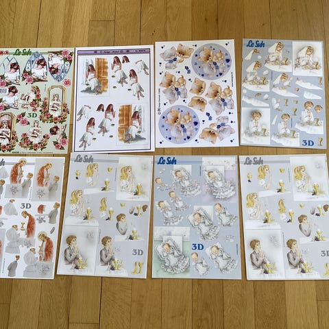 Har igjen Mye 3D ark til dåp,konfirmasjon, bryllup, barn etc. og Stickers etter endt butikk som selges veldig billig. Stickers er i gull/ sølv etc. Border, hjørner, tekst etc. Tatt bilde av noe, men gi meg beskjed hvis jeg skal ta flere bilder av f.eks blomster. De ferdig ustanselig pakkene med 10 motiver koster kr.25,- pr.pk
