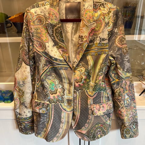 Svært pent brukt blazer fra Just Cavalli med sommerfulgprint. Italiensk str 42, tilsvarer norsk 38/medium. Beige, rød, grønn, multifarget.