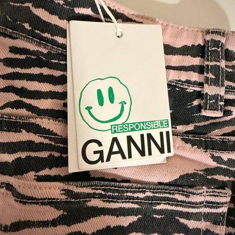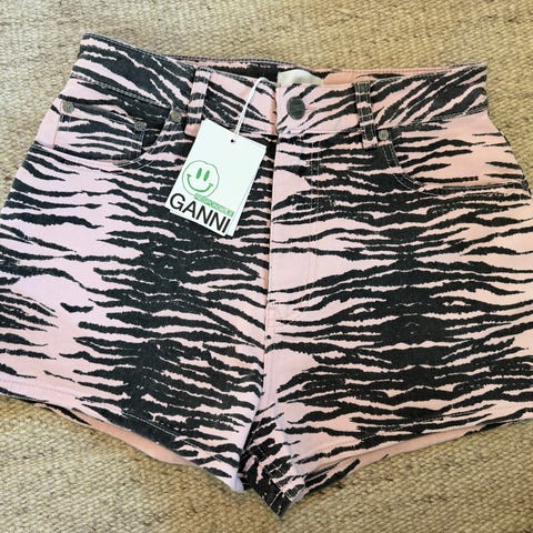 Selger en helt ny veldig kul rosa og sebra stripete Denim shorts til dame fra GANNI i str. 25 for kr: 500.