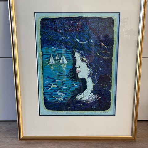Joma maleri med motiv av engel og kvinne i blå og hvit kjole, flygende over en bysilhuett i kveldslys. Bildet har mørk bakgrunn med grønn- og gulfarger, samt måne på himmelen. Signert «Joma» nede på lerretet. Leveres innrammet i profilert gullfarget ramme, klar til oppheng med opphengswire på baksiden.