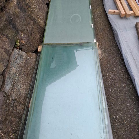 Herdet glass (9 stk. 102,5 x 89 cm og 2 stk 112,5 x 89 cm. Drivhus / utestue