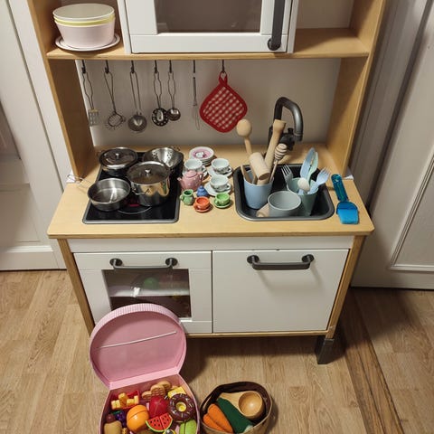 Med på kjøpet får du masse lekemat og utstyr. Alt er i tre, tøy eller metall. Kjøkkenet har lyd og lys i vasken og lyd/lys på koketoppen. Det vokser rødbeter og gulrøtter i plantekassen. I kjøleskapet er det isbitmaskin 🤩 Timesvis med lek og moro!